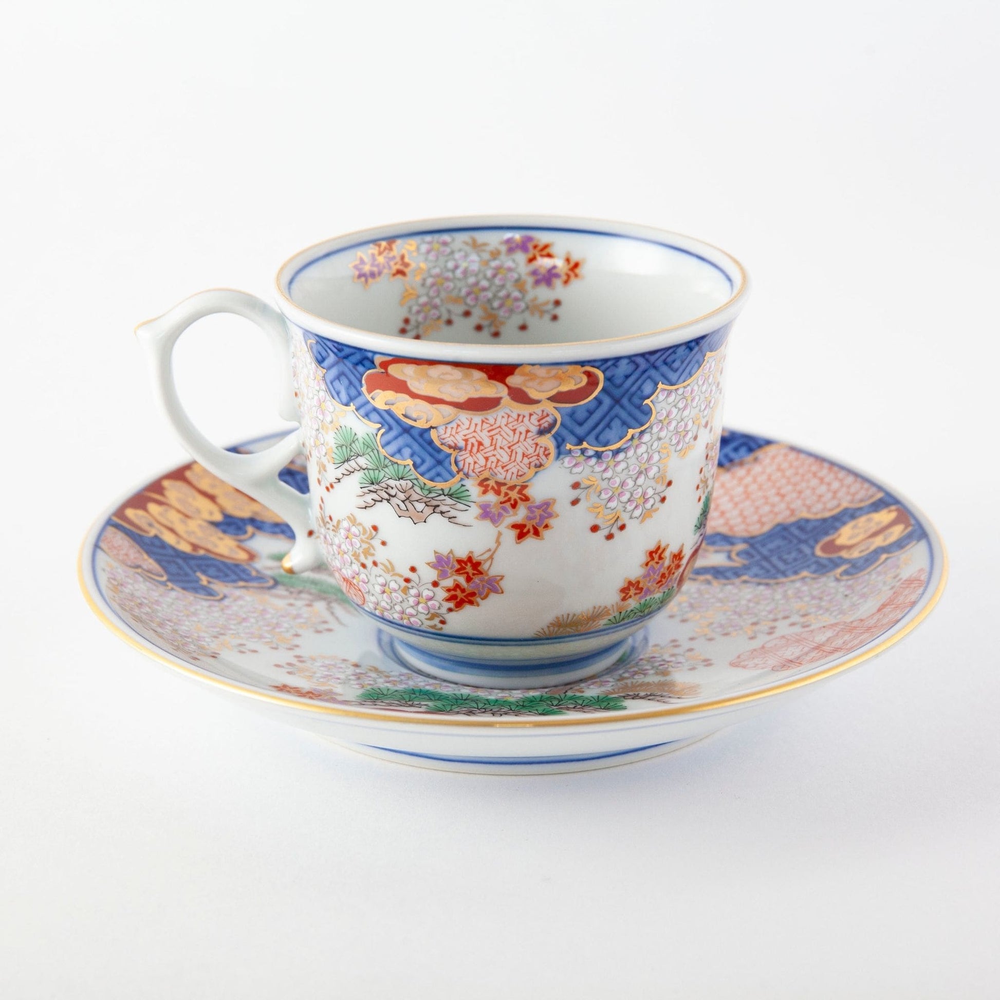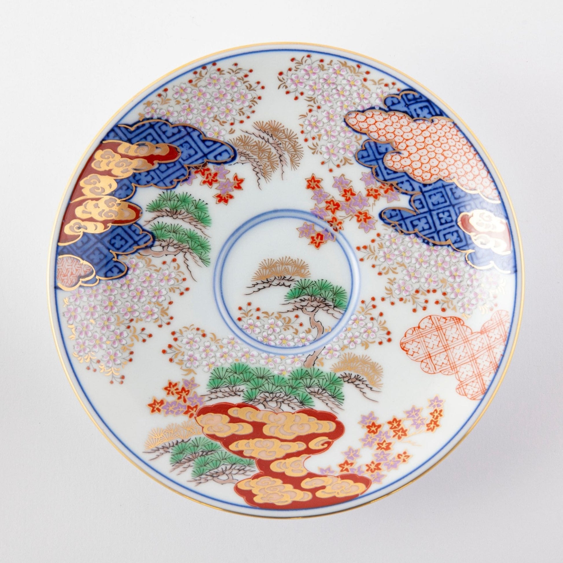 This captivating Arita Spring and Autumn Cup and Saucer Set, brought to you by Shobido Honten, infuses your home with a touch of timeless elegance. The design on the pristine white porcelain features a poetic portrayal of the Japanese seasons. Delicate cherry blossoms represent spring, while vibrant autumn leaves and verdant pine trees complete the cycle. This enchanting motif, meticulously hand-painted by skilled Arita-ware artisans, is a testament to the enduring heritage of this esteemed Japanese craft.