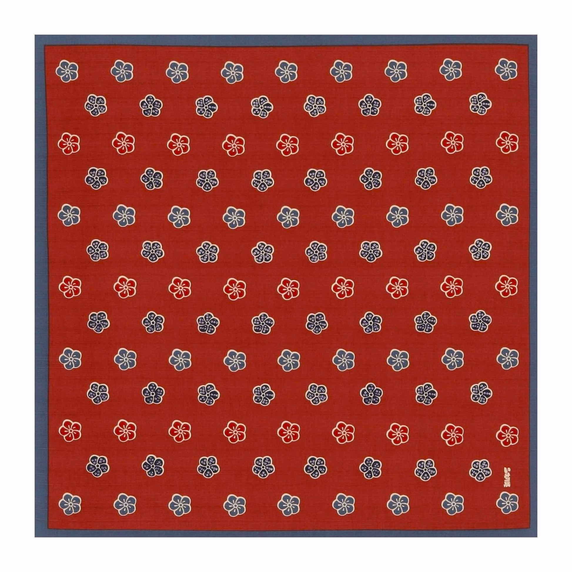 A captivating dance of color unfolds on the Isetatsu Plum Organic Cotton Furoshiki Wrapping Cloth by Miyai Furoshiki. Skilled artisans weave a mesmerizing scene of red and blue plum blossoms against a deep, rich red background. The vibrant blooms, traditionally symbolic of resilience and perseverance in Japanese culture, are framed by a delicate blue border. Crafted from 100% organic cotton, this furoshiki is a luxuriously soft and sustainable alternative to conventional gift wrap.