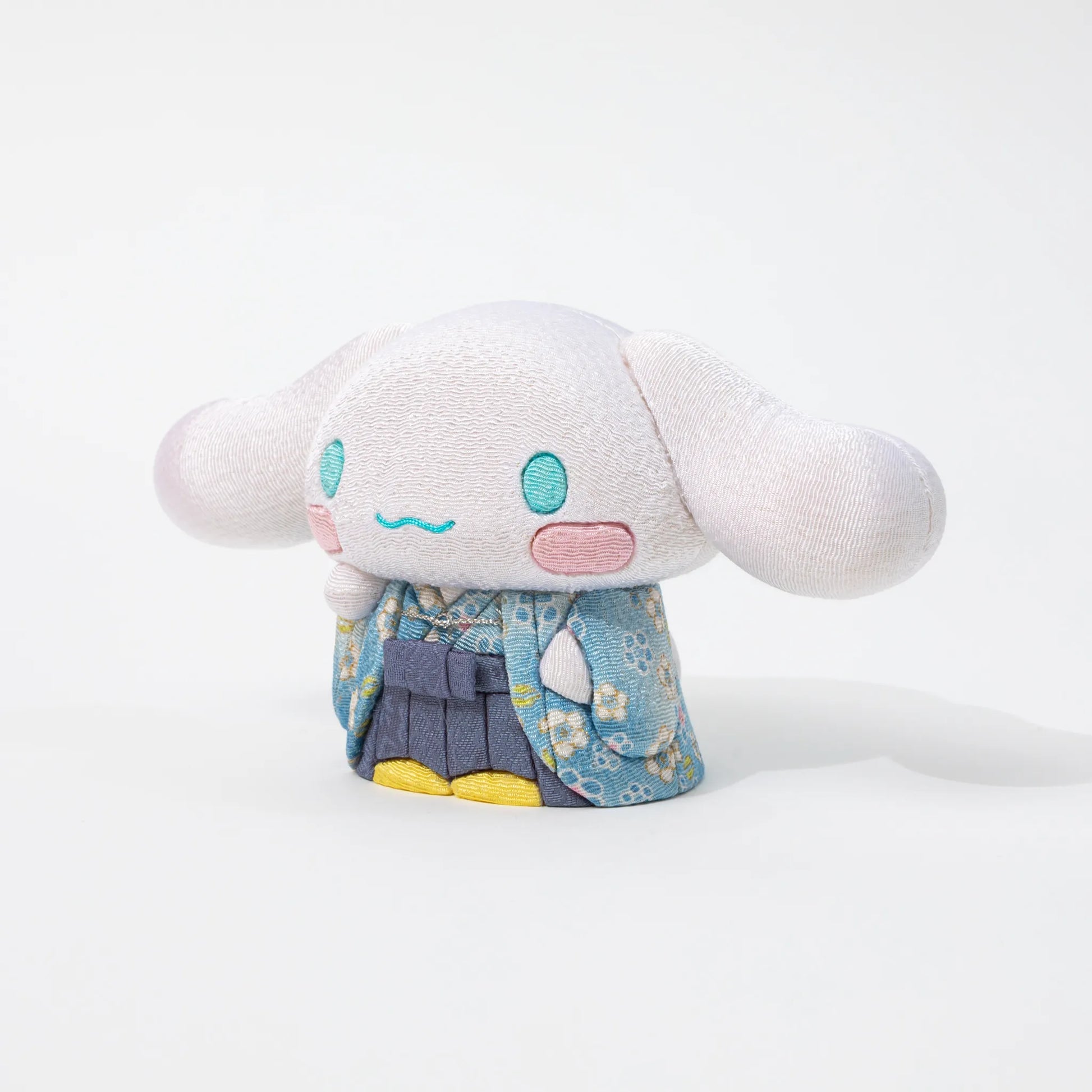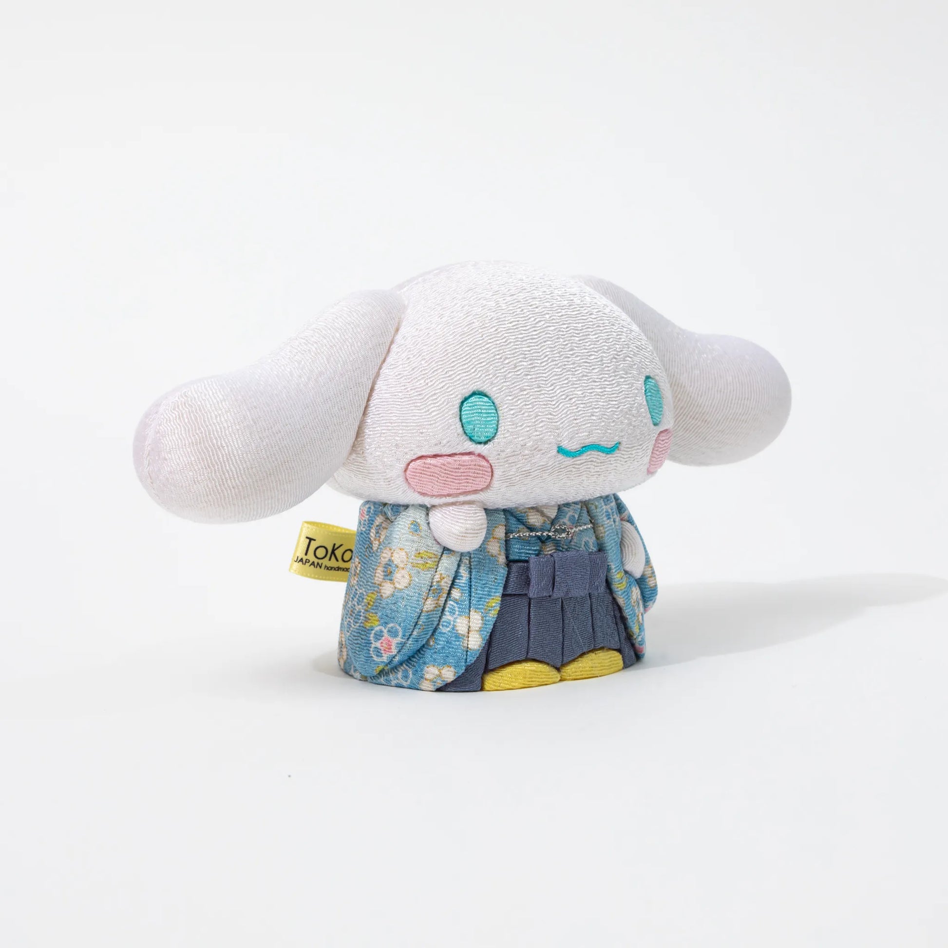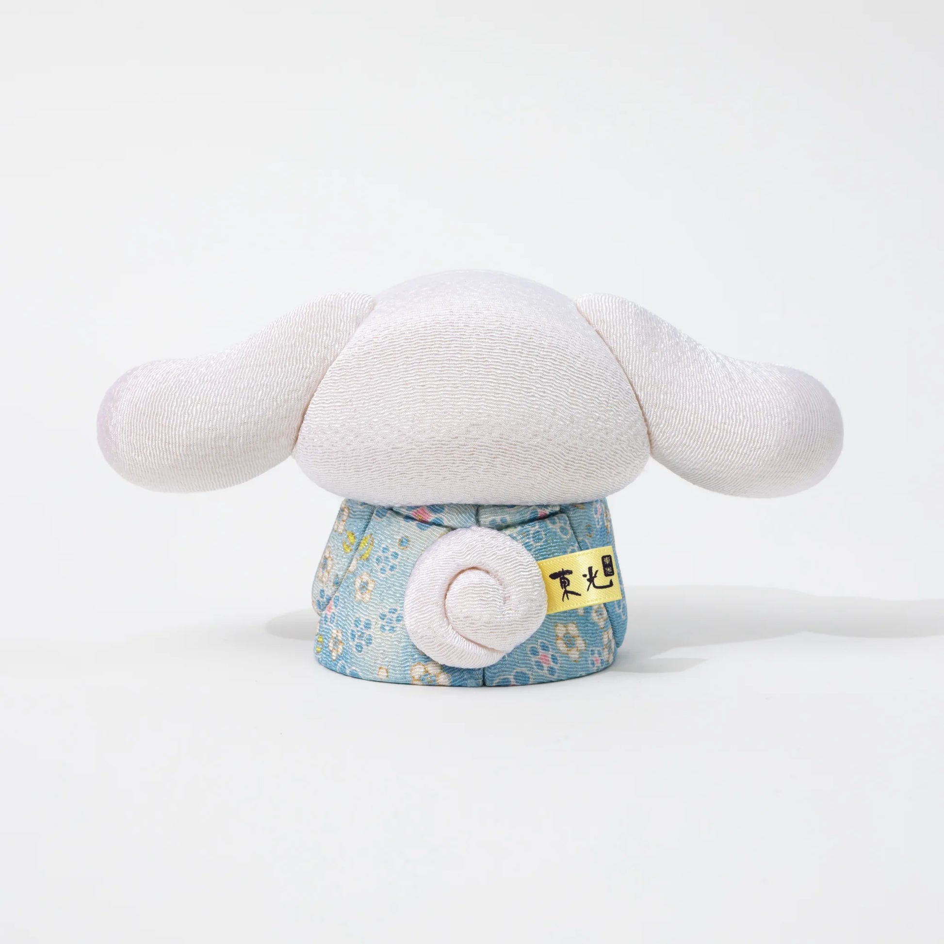 Sanrio’s beloved Cinnamoroll takes on a refined new form in this Edo Kimekomi figure handcrafted by Kakinuma Toko, a studio preserving the traditional doll-making techniques of Japan. Clad in a soft blue kimono with sakura motifs and finished with gentle pleats and a hakama-style silhouette, this Cinnamoroll blends charm with craftsmanship. His bright yellow feet peek out beneath the hem, and a curled tail peeks from the back—each detail delicately inlaid using the kimekomi technique, where fabric is tucked into carved grooves on a paulownia wood base.
