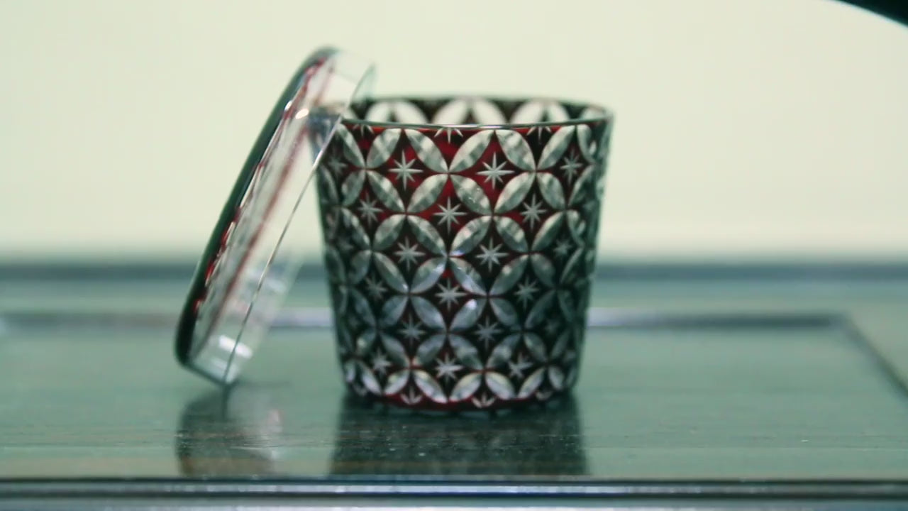Each lidded cup is lovingly crafted through mold-blowing; a glass-blowing method that is achieved by using a carved mold. It can be used not only as tableware but also as an eye-catching candleholder. The unique red glass and precise incisions combine to create a stunning symphony of colors and light reflections that will mesmerize you.