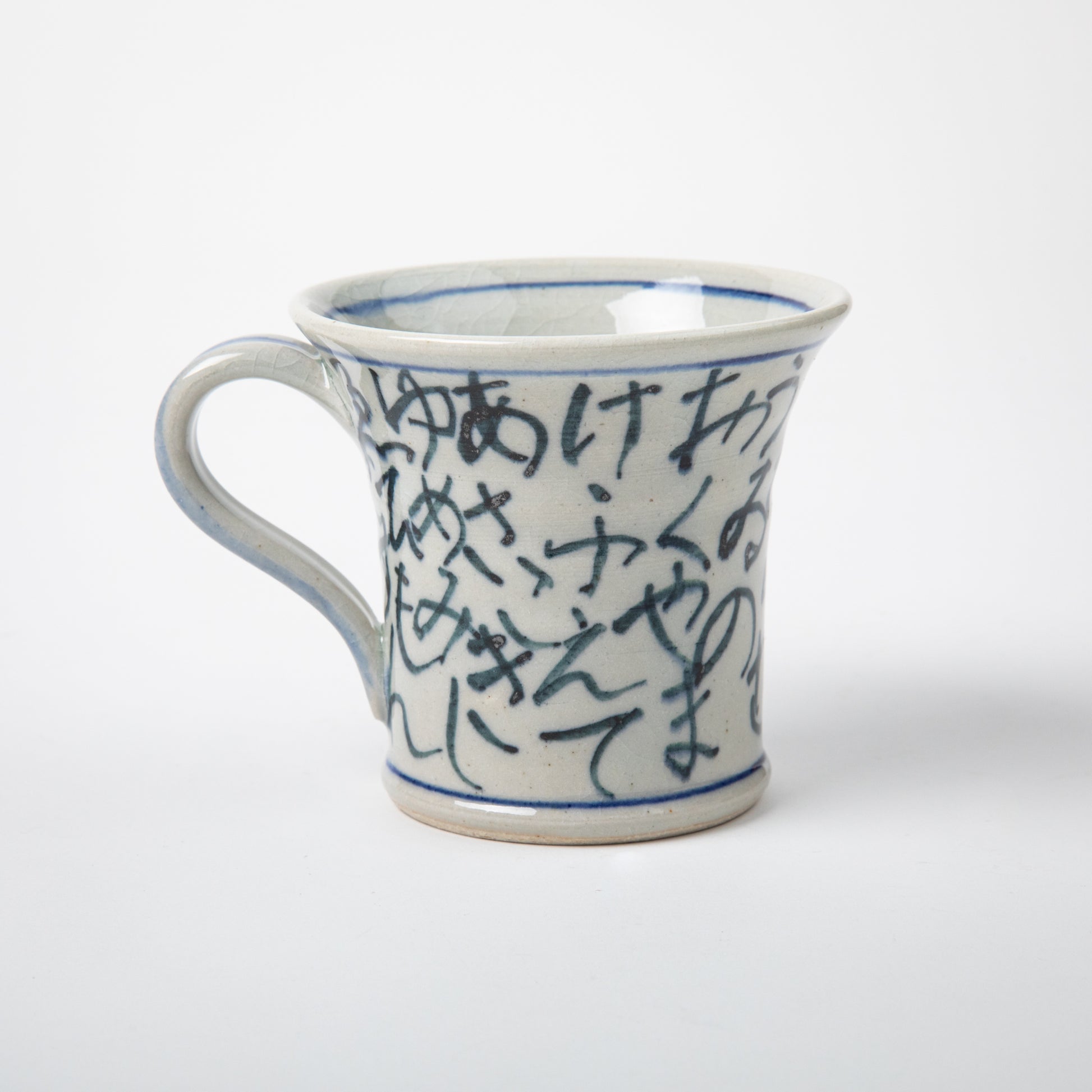 The Iroha Sometsuke Shigaraki Mug by HECHIMON is a perfect blend of traditional craftsmanship and aesthetic beauty. This exquisite mug features the characters of the famous Iroha, a phonetic poem showcasing the traditional order for Japanese characters, in a mesmerizing kata-e design, gracefully adorning the surface. The delicate blue script stands out against the natural white background, creating a harmonious balance that is both visually captivating and deeply meaningful.