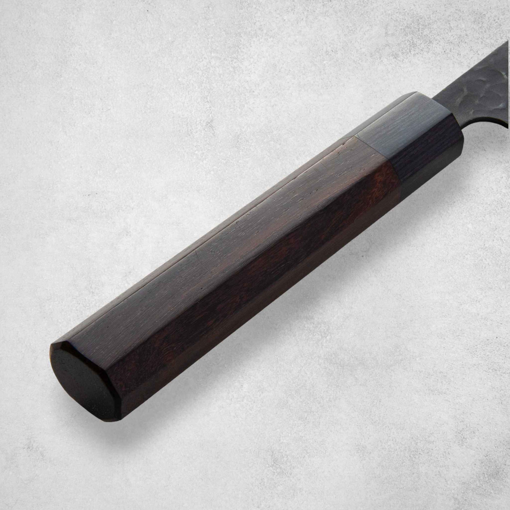 "Kurohada" translates to "black skin," referring to the dark, textured appearance of the blade's surface. This distinctive texture is achieved through the Tsuchime technique, where the blade is hammered to create small, irregular dimples on its surface. These dimples not only enhance the knife's aesthetic appeal but also serve a practical purpose by reducing food adhesion to the blade, making slicing and chopping more efficient.