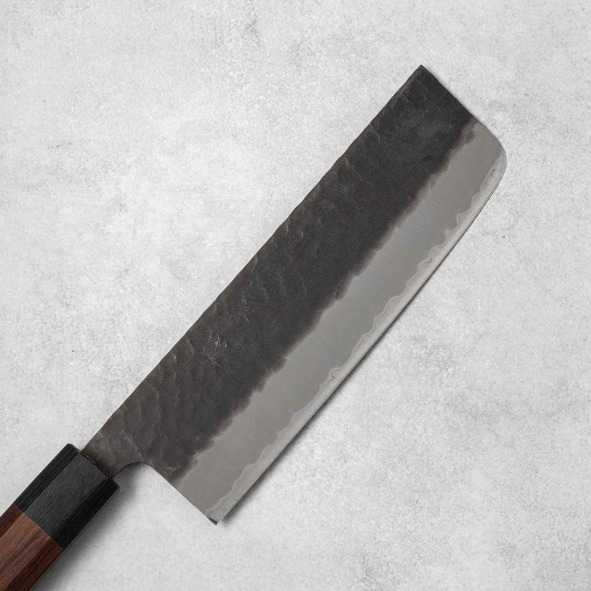 The Kurohada Tsuchime Nakiri Knife - a true culinary gem, crafted from Aogami Blue Super Steel and with a stunning Rosewood handle, is renowned for its remarkable durability and sharpness.