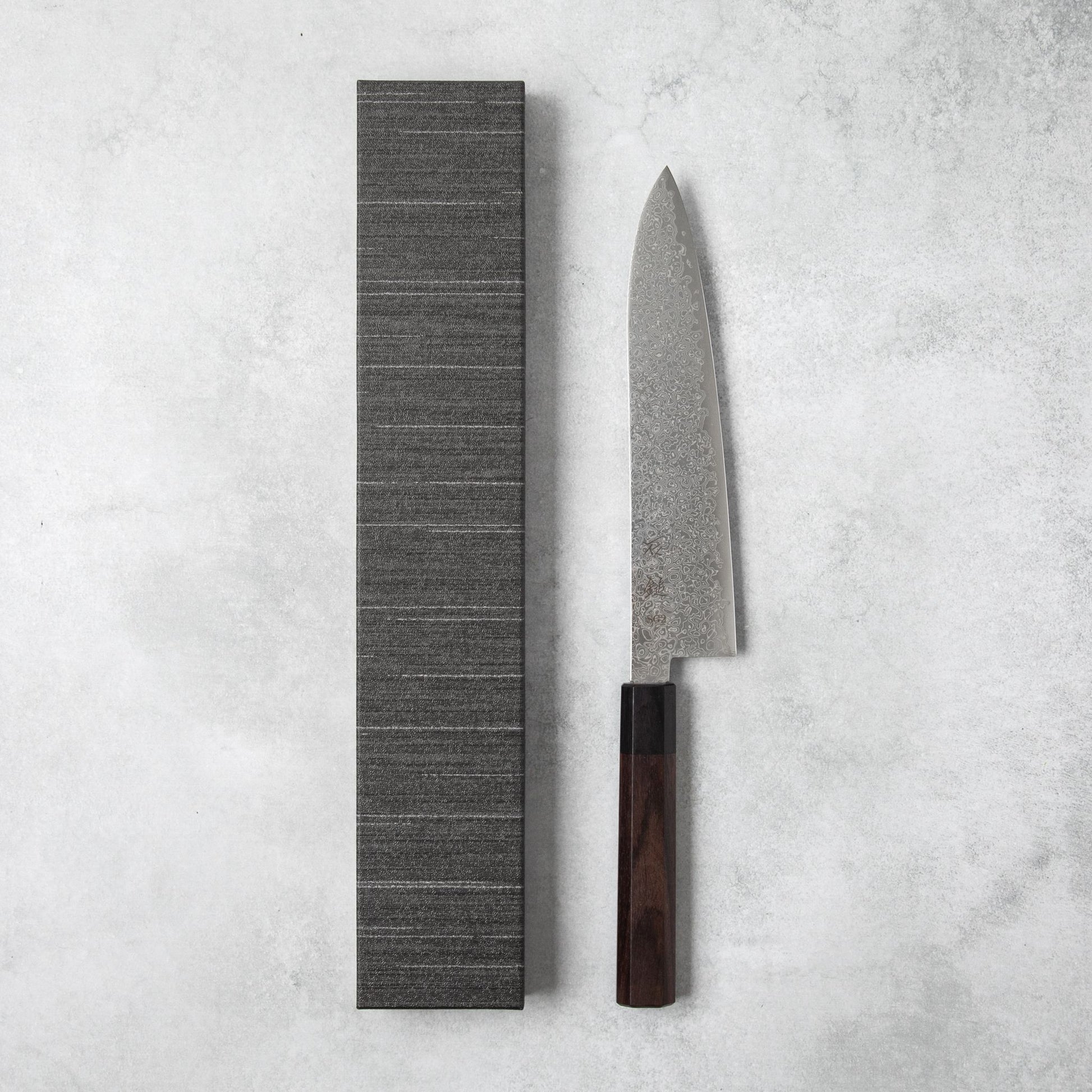 Handforged with precision and care, this Nickel Damascus Chef Knife by Ishizuchi Knives is a testament to Japanese craftsmanship. Made from high-quality SG2 steel, renowned for its exceptional hardness and edge retention, this knife ensures unparalleled performance in the kitchen.