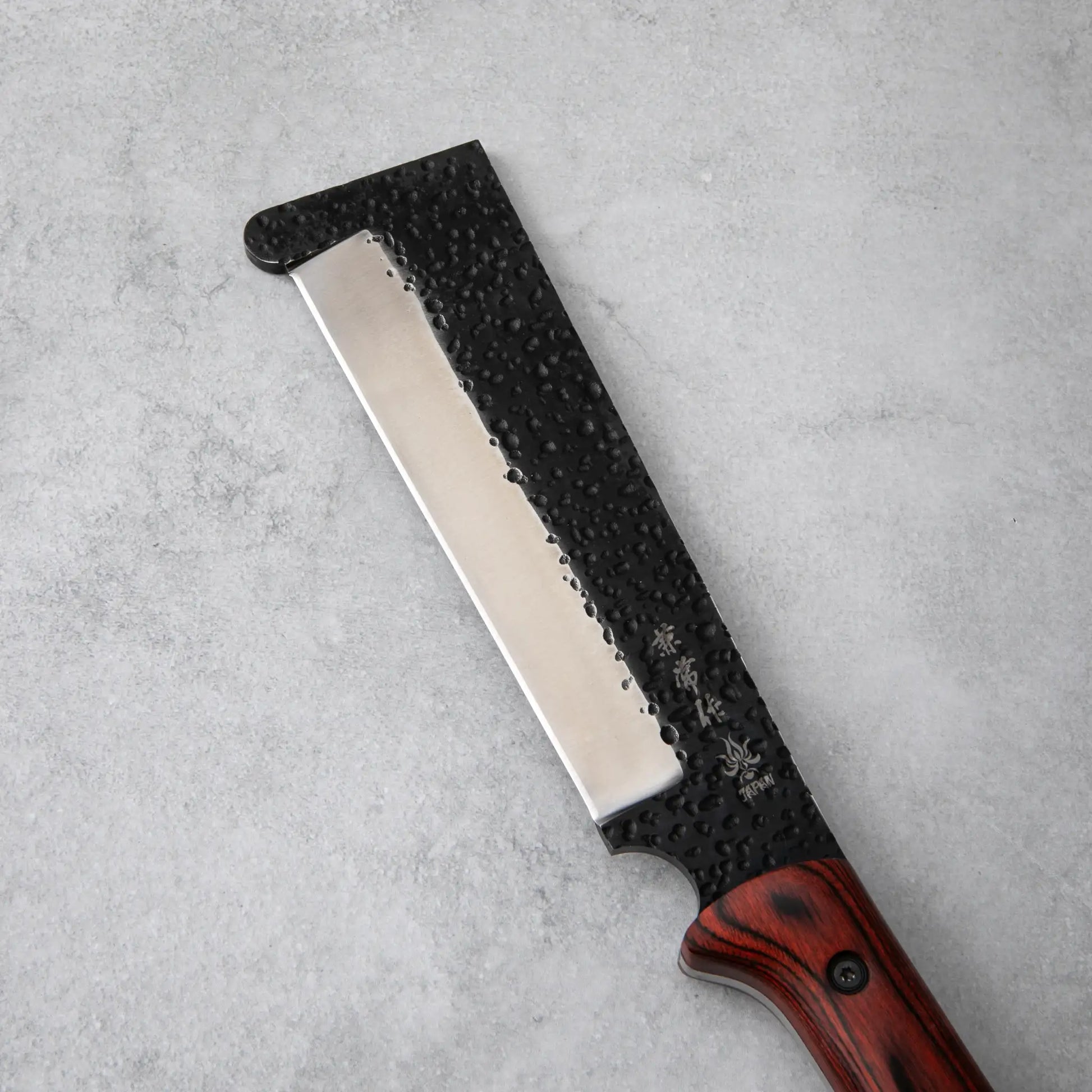 The blade is forged from a mono-layer of AUS-8 stainless steel, known for its excellent balance of toughness, edge retention, and corrosion resistance. Finished with a tsuchime (hammered) texture, the darkened blade surface not only enhances its rustic beauty but also helps reduce friction during cutting. With a substantial thickness of 6mm, the blade is engineered to withstand hard impacts, while the intentional bump near the tip acts as a safeguard when striking the ground by mistake.