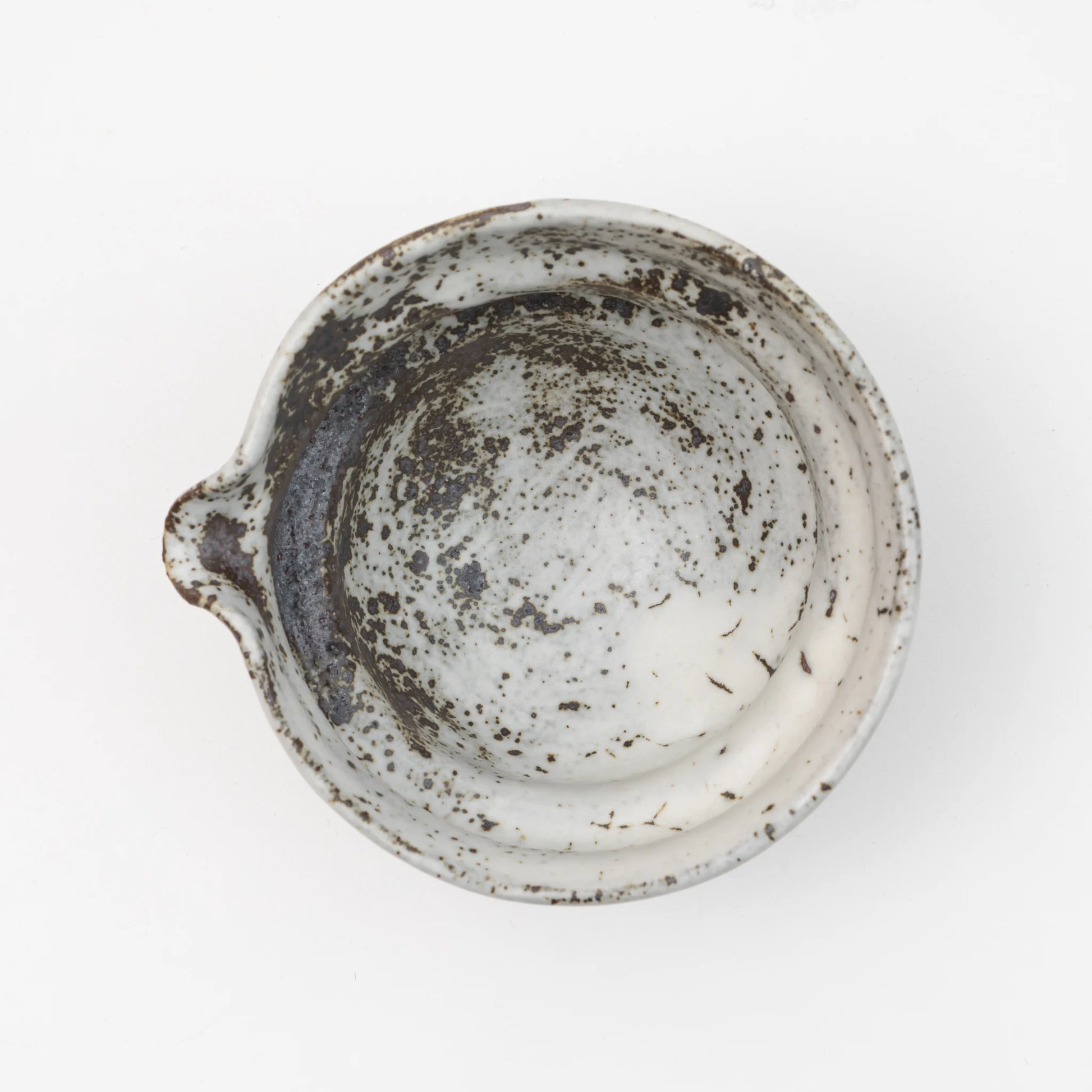 A pale glaze softens the iron-rich clay beneath, while flecks of black and charcoal rise to the surface in organic patterns, evoking stone, snow, or ink-splashed parchment. At the base, the unglazed foot and signature seal affirm NINSHU’s commitment to material honesty and traditional craftsmanship. Ideal for matcha preparation or as a small pourer for sauces and teas, this vessel reflects the values of restraint, utility, and natural elegance—an object not just for use, but for contemplation.