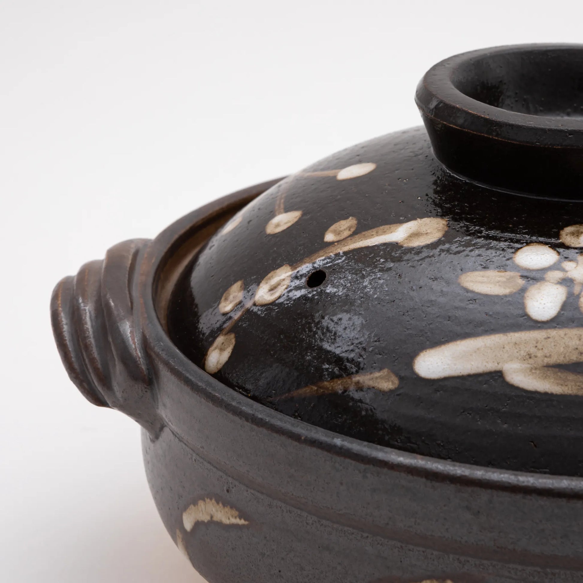 Rooted in tradition, this black clay donabe from Sajitouki is adorned with hand-painted plum blossoms that lend it both warmth and quiet charm. Made for 2 to 3 people, its compact size is ideal for preparing small hot pot meals or slow-cooked stews. The glossy black glaze, gently interrupted by the natural tones of the clay beneath, gives it a rustic elegance, while the subtle vent on the lid ensures smooth steam release. Inside, the pale clay interior contrasts beautifully with the exterior, highlighting the pot’s natural simplicity. Sajitouki’s craftsmanship brings together beauty and function—this piece transitions seamlessly from stove to table, inviting shared meals and conversation. A timeless addition to your kitchen, rooted in everyday Japanese life.