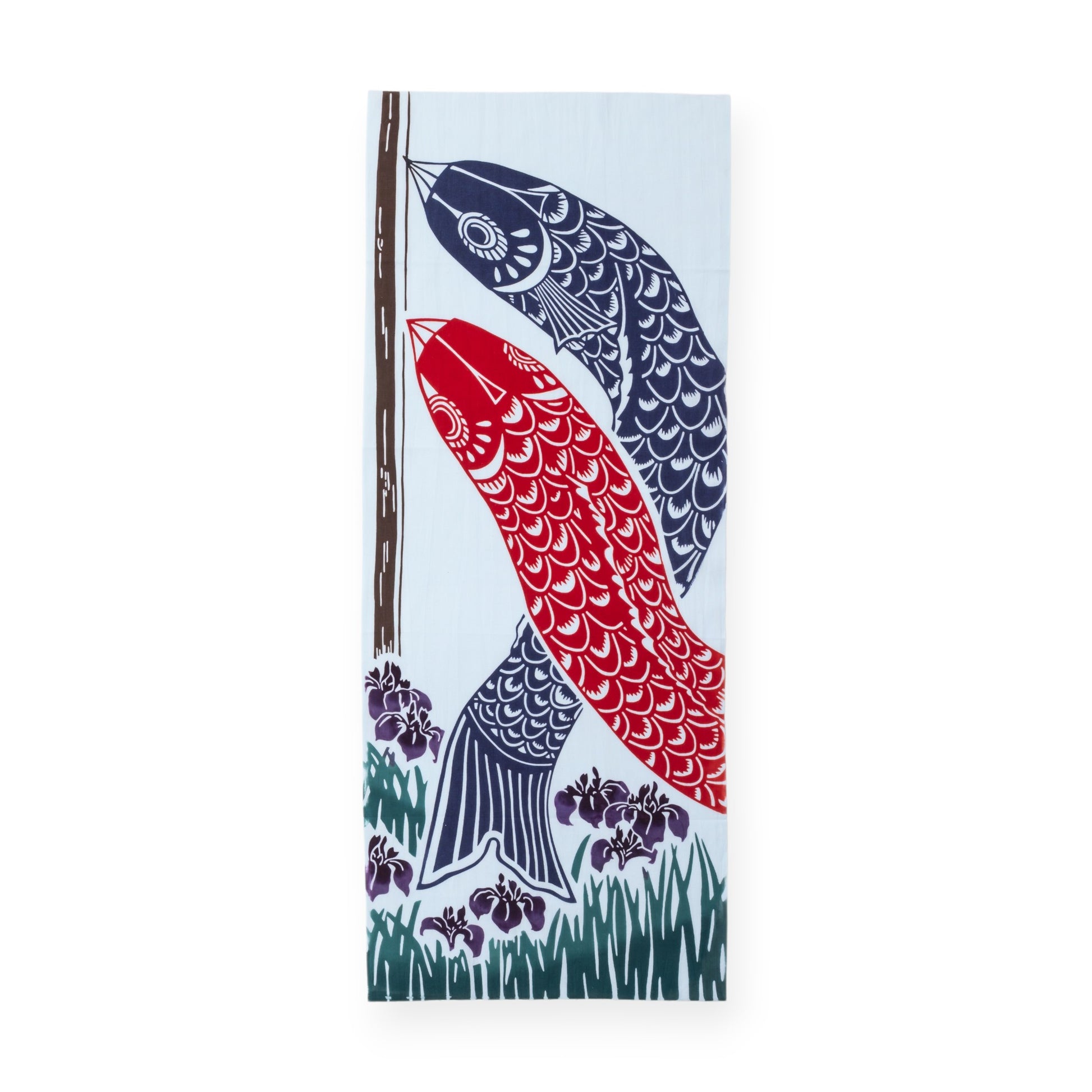 A bold expression of strength and celebration. This tenugui by Rienzome captures the uplifting spirit of Koinobori, traditional carp streamers flown in Japan to honor Children's Day. Set against a serene sky blue, two vividly detailed carp—one red, one navy—rise with graceful energy above a patch of blooming irises.