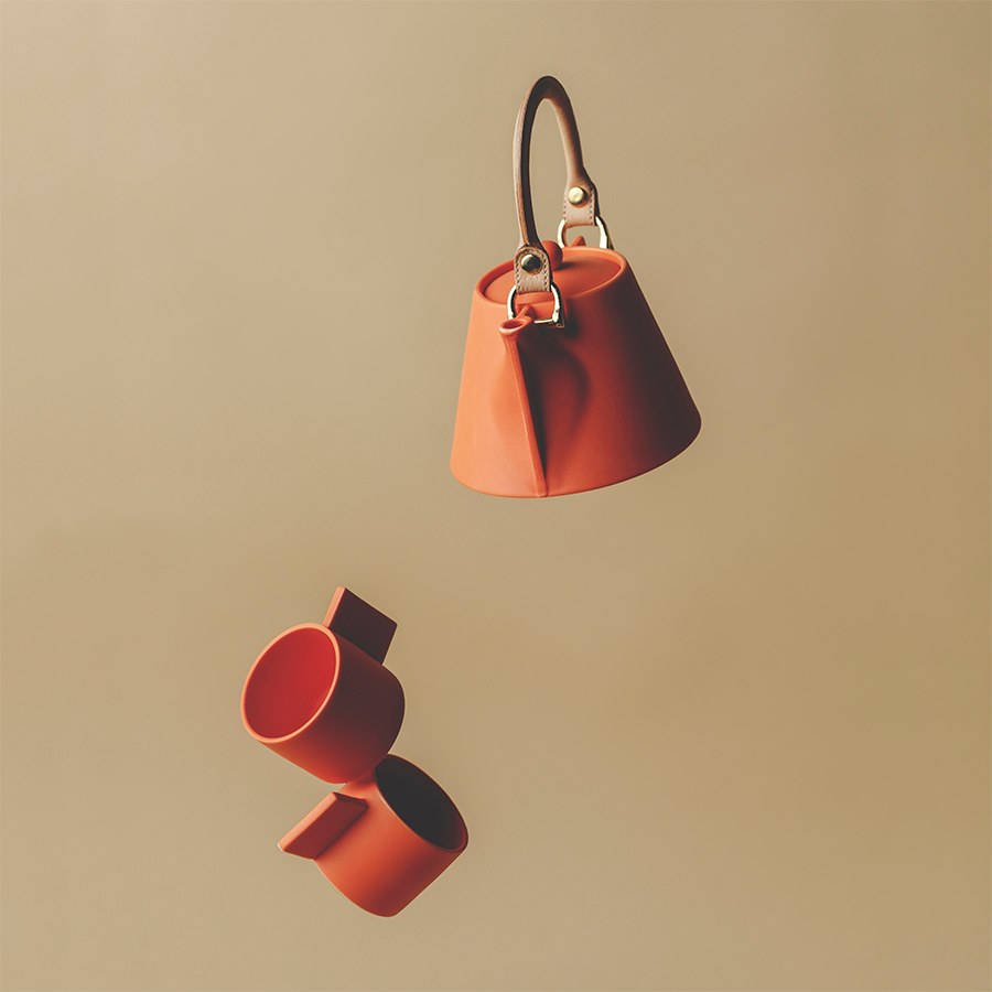 The teapot's detachable leather handle was made to resemble a traveling handbag, and its two stackable cups are designed to be space-saving.