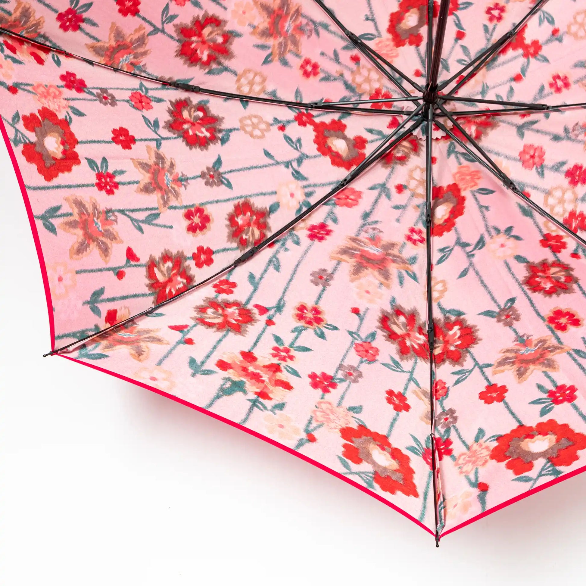A striking blend of tradition and elegance, the Wabana Folding Umbrella in Red captures the essence of Komiya Shoten's craftsmanship. Made with premium Kōshū-ori fabric from Yamanashi Prefecture—renowned for its 400-year textile heritage—this umbrella is dyed using the saki-zome technique, producing a deep, radiant red. The intricate floral pattern, achieved through the ura-hogushi-ori weaving method, reveals a subtle contrast between the inner and outer surfaces.