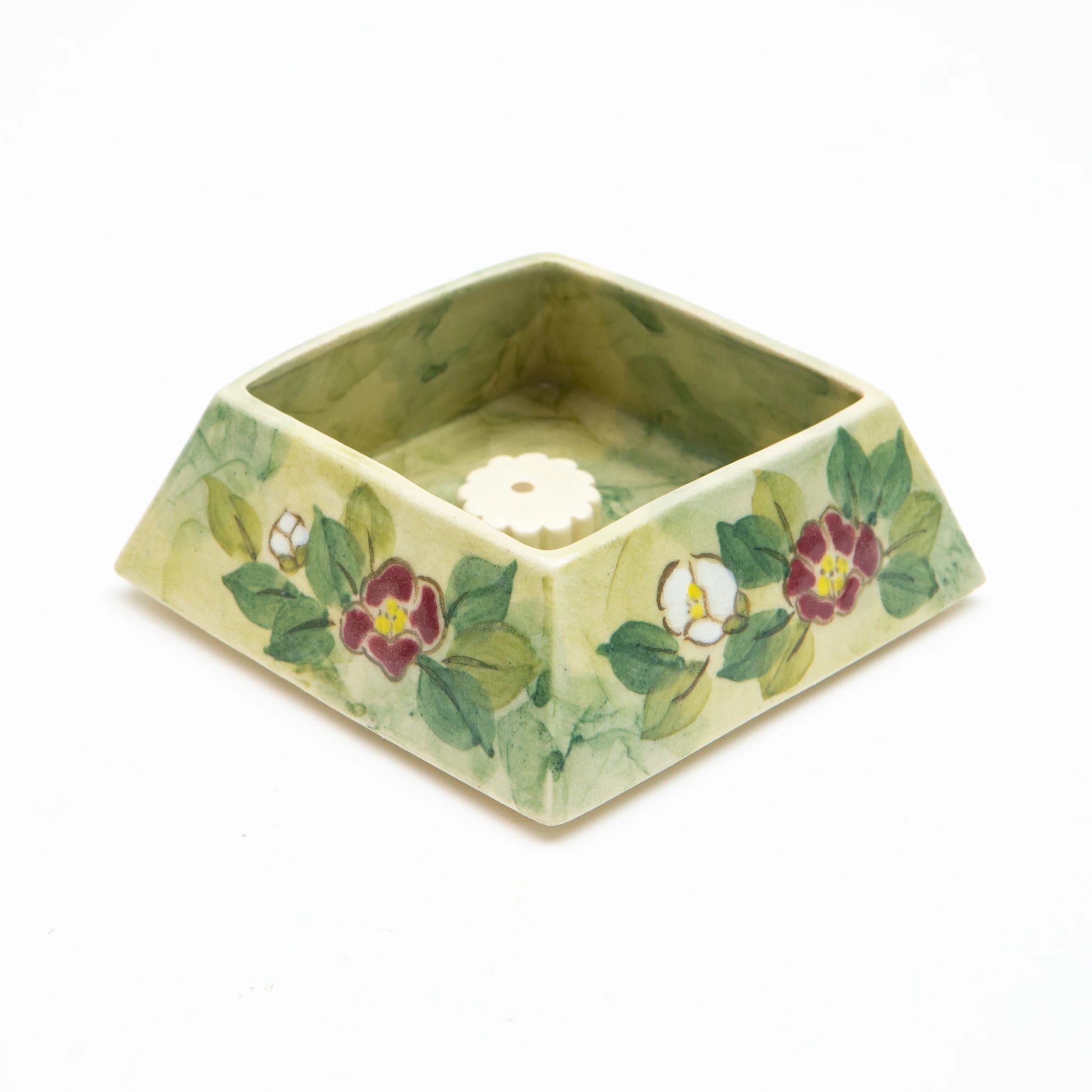 The camellias, rendered in deep red and ivory with layered green leaves, are painted with a fluid touch that reveals the movement of the brush beneath the glaze. The interior well is designed to hold an incense holder securely, while the raised edges frame ash with quiet discretion. Its geometry feels intentional and grounded, offering both structure and visual clarity.